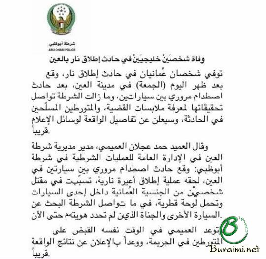 واوضح العميمي انه وقع حادث اصطدام مروري بين سيارتين في العين لحقته عملية اطلاق أعيرة نارية تسببت في مقتل شخصين من الجنسية العمانية داخل سيارة تحمل لوحة أرقام قطرية، في ما تواصل الشرطة البحث عن السيارة الأخرى والجناة الذين لم تحدد هويتهم حتى الآن.